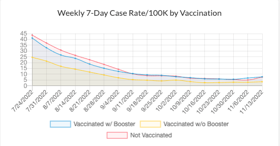 There does seem to be a slight increase, but it is hard to tell if it is just noise, or the start of another winter spike in cases. In any case, I am scheduled for another Evusheld injection in early December. Hopefully, that and the last booster shot will prevent another infection.