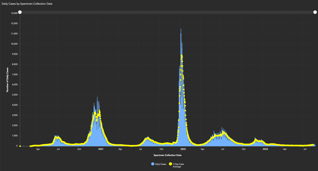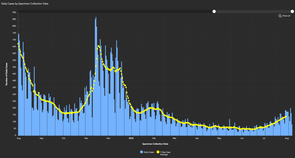 From the top chart, the number of new cases seems flat when compared to the past spikes in cases. If you zoom in to the past twelve months, there is a rise in cases since the summer. Will that continue, flatten out, or even decrease? I heard there may be a new vaccine out in September. Is this rise due to the long wait since the last approved booster?