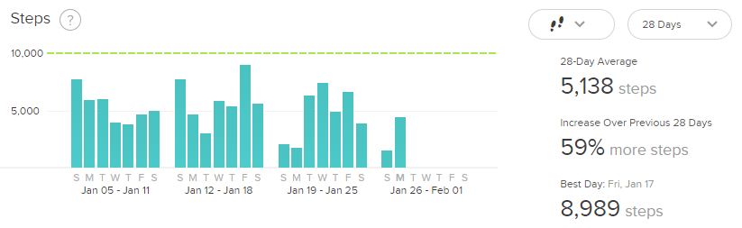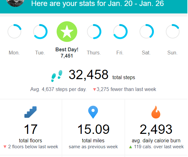 Hmm, not good. Another week with decreasing activity (steps). Maybe I’m relying too much on the 30 minute cardio portion of rehab and not going out walking enough.