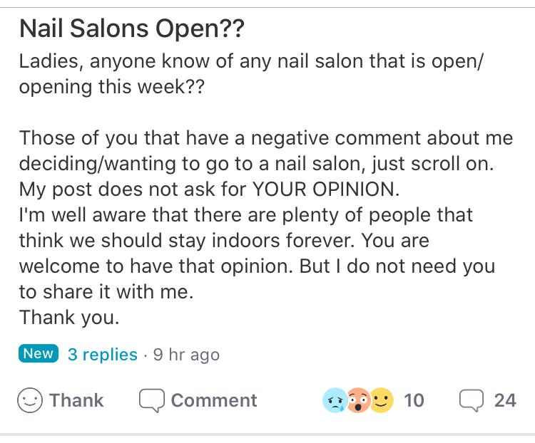 No, stupid woman. It’s a public forum. If you get to ask stupid questions in public, then we get to comment on how you’re an idiot. Of all things to risk your life for… a pedicure. In the comments, she keeps throwing out the strawman of either going out now or staying home forever. No, you can also stay home a bit longer until medical professionals tell you otherwise. I imagine her name is Karen.